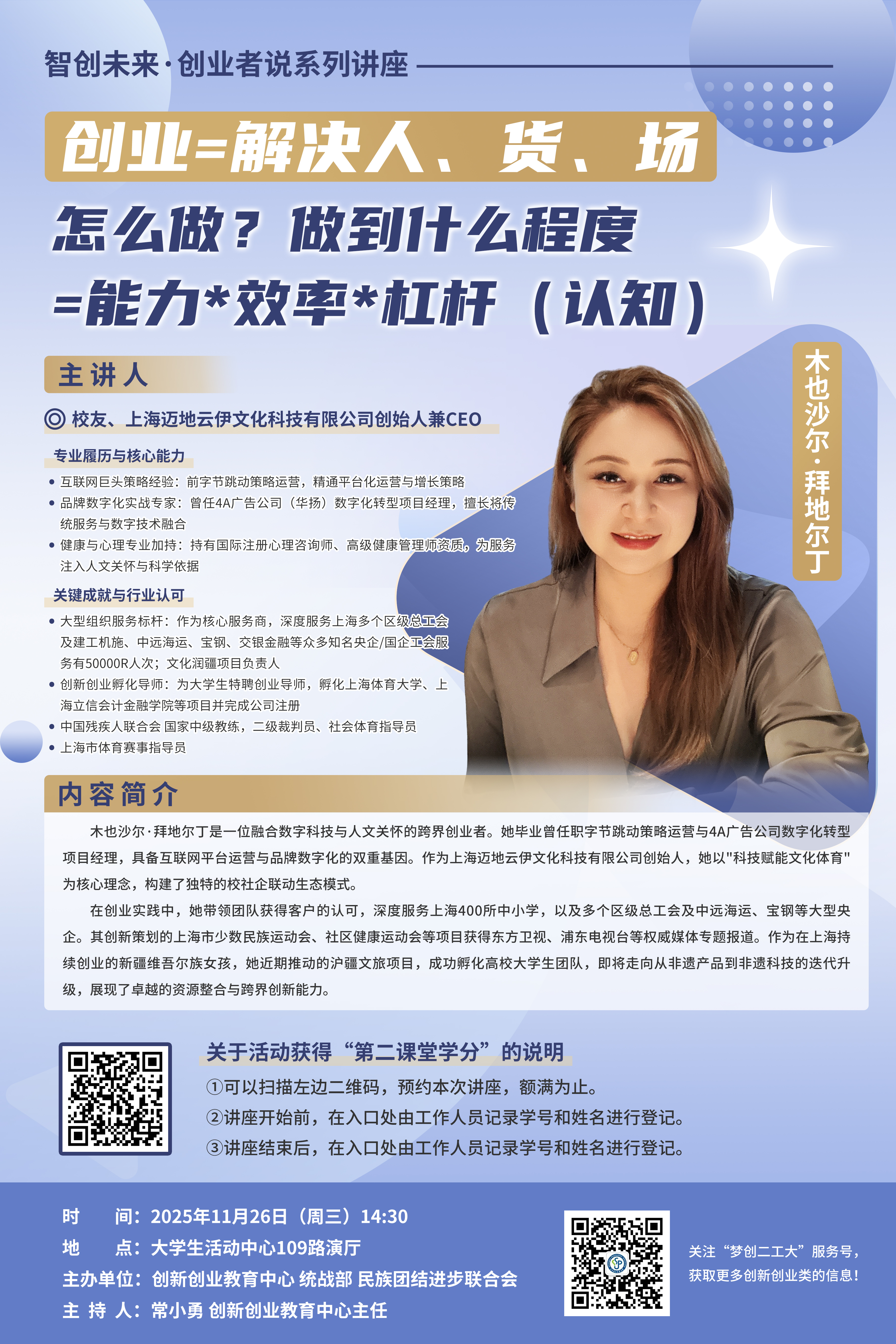 主讲人:木也沙尔·拜地尔丁 校友、上海迈地云伊文化科技有限公司创始人兼CEO