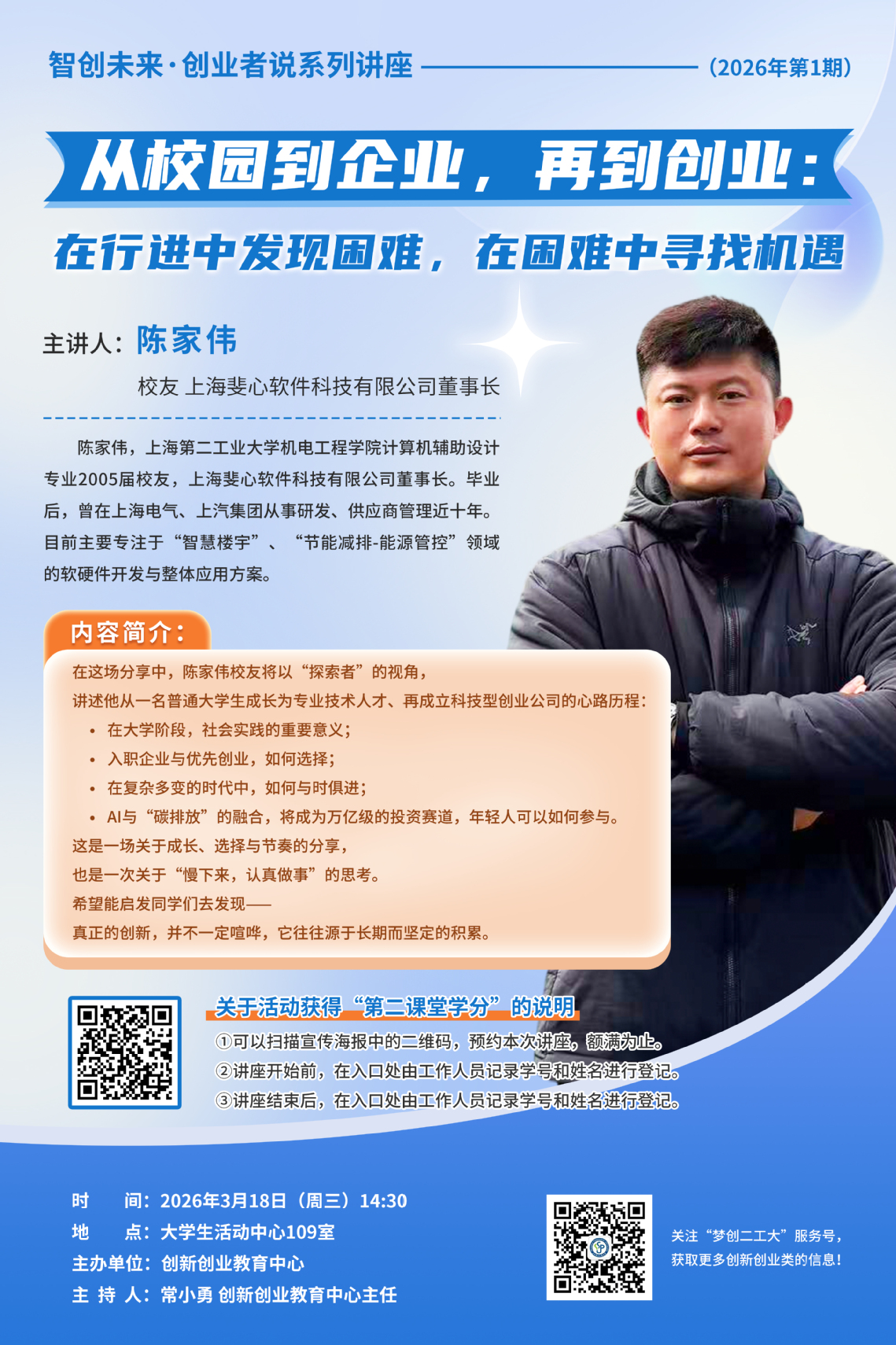 主 题:从校园到企业,再到创业:在行进中发现困难,在困难中寻找机遇