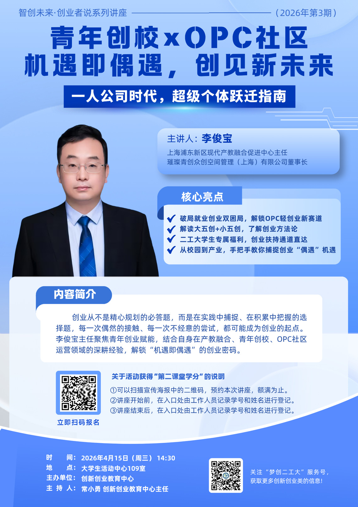 主 讲 人:李俊宝 上海浦东新区现代产教融合促进中心主任、璀璨青创众创空间管理(上海)有限公司董事长